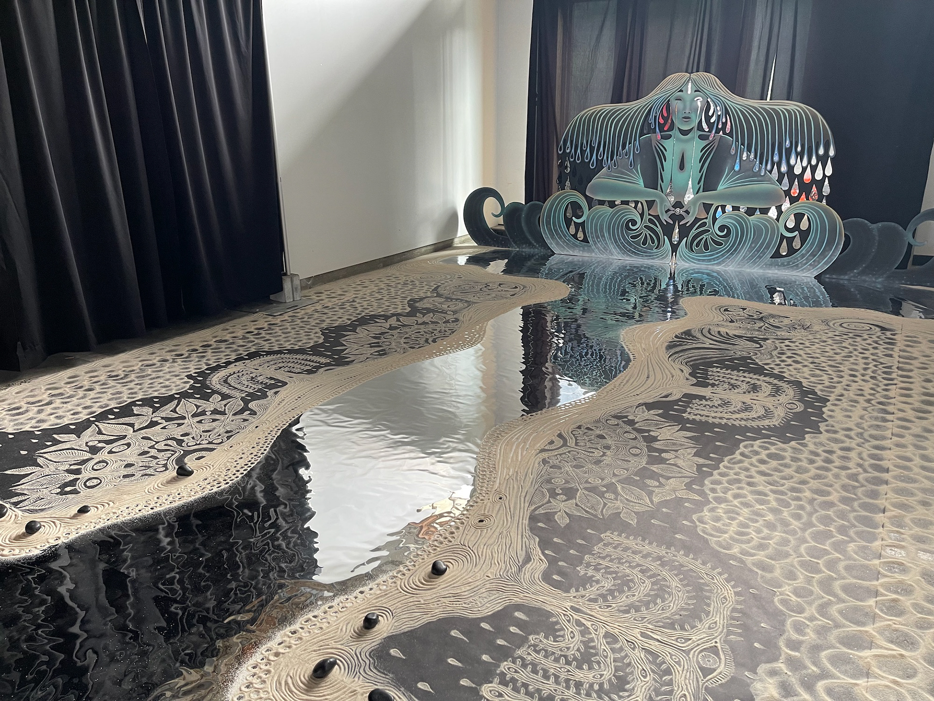 “Mother of Waters” is a 20'x20' installation sponsored by Tacoma Ocean Fest at the Foss Waterway Seaport Museum. The installation depicts the sacred relationship between mountains, rivers, and the ocean, each giving birth to the other in an endless cycle of life and rebirth. In particular, this Mother of Waters depicts our local Mount Tahoma, mother of the waters in the Puyallup Watershed. Emanating from her core is the Puyallup River, and the sand drawing at the river's shores represent the lands, forests, people, and ecosystems the waters nourish. The river ends where the viewers stand, signifying that we, the viewers, are the ocean.