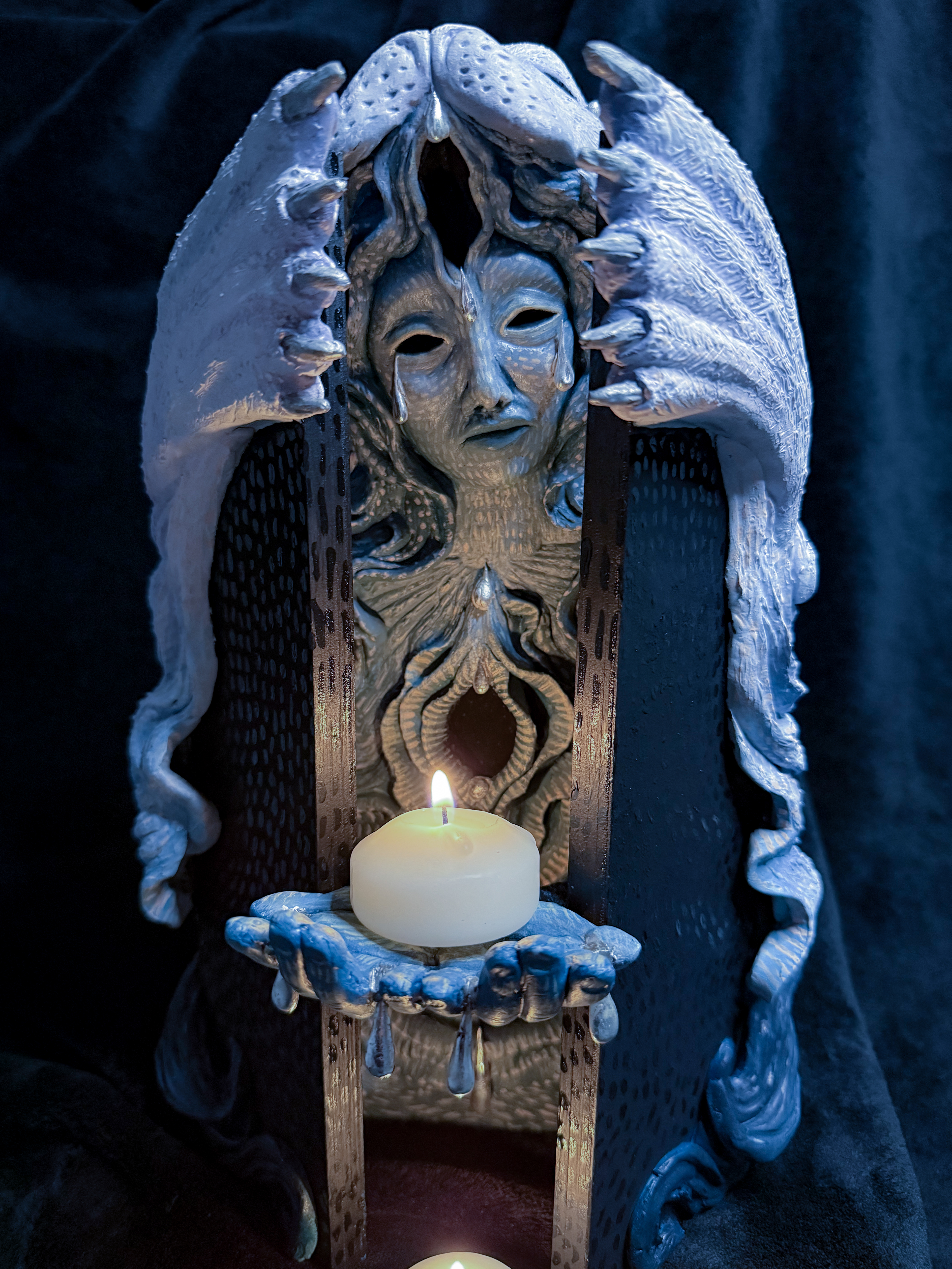 The figure’s exterior is protective, wrapped in a seal-like form that shields her inner self. She offers light to others, but the skin guards her from being fully exposed. The piece meditates on the holiness of sadness and the painful necessity of boundaries for those who live with open hearts.